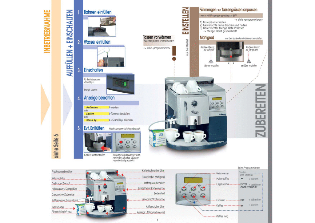 Die Bedienungsanleitung für die Saeco Magic Deluxe Kaffeemaschine ist ein unverzichtbares Benutzerhandbuch für alle Kaffeeliebhaber, die das volle Potenzial ihrer Maschine ausschöpfen möchten. Diese Gebrauchsanweisung bietet detaillierte Anweisungen zur Zubereitung von Espresso und Kaffee in verschiedenen Intensitäten (stark, mittel, schwach) und beschreibt die Möglichkeit, Kaffeepulver zu verwenden. Dank der Betriebsanleitung können Nutzer ihre Maschine problemlos bedienen und von den zahlreichen Merkmalen profitieren. Sollte Ihre Saeco Magic Deluxe Probleme wie Wasser blinken oder entlüften haben, finden Sie in diesem Anwenderhandbuch nützliche Tipps zur Fehlerbehebung. Ergänzend dazu bieten wir PDF-Versionen der Saeco Magic Comfort Bedienungsanleitung und der Saeco Magic de Luxe Reparaturanleitung an, um alle Ihre Anforderungen abzudecken. Mit genauen Schritt-für-Schritt-Anleitungen sorgt das Handbuch dafür, dass Ihre Kaffeemaschine stets optimal funktioniert. Diese umfassende Anleitung ist mehr als nur ein einfaches Handbuch – sie ist der Schlüssel zur perfekten Kaffeezubereitung. Egal, ob Sie ein erfahrener Benutzer sind oder Ihre Reise mit der Saeco Magic Grade begonnen haben, dieses Dokument wird Ihnen helfen, das Beste aus Ihrer Maschine herauszuholen.